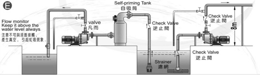泵的自吸高度隨葉輪的圓周速度U2的增大而增大,但到最大自吸高度時,轉(zhuǎn)數(shù)增加而自吸高度就不再增加了,此時只是縮短自吸時間;當轉(zhuǎn)數(shù)下降時,自吸高度則隨著下降。在其它條件不變的情況下,自吸高度還隨著儲水高度的增加而增加(但也不能超過分離室的最佳儲水高度)。為了在自吸泵中更好地使氣水混合,葉輪的葉片須少些,使葉柵的節(jié)距增大;并宜采用半開式葉輪(或葉輪槽道較寬的葉輪),這樣更方便于回水深入地射進葉輪葉柵中。應(yīng)盡量避免將自吸泵裝設(shè)于戶外。若必需安裝于戶外時,應(yīng)覆蓋保護蓋,若泵浦配備有電子控制器時,則需加以保護。