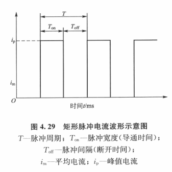脈沖電鍍所用的電流波形有方波〔或稱矩形波〕、正弦半波、鋸齒波和間隔鋸齒波等多種形式,一般鍍單金屬以矩形波為好。矩形脈沖電流波形如圖4.29所示。