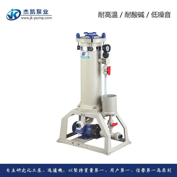 杰凱化學(xué)藥液過(guò)濾機(jī)主體采用PP材料注射成型,可根據(jù)客戶要求選用透明壓克力材質(zhì)和PVC材質(zhì);化學(xué)藥液過(guò)濾機(jī)